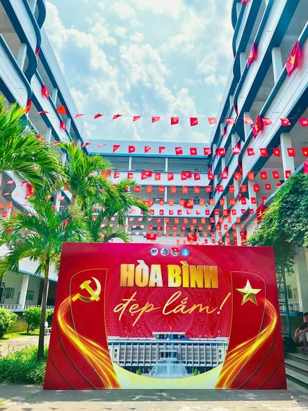 Một số trường treo cờ dây sao Đảng cố định quanh sân hoặc hành lang nhằm tạo bối cảnh giáo dục chính trị trực quan.