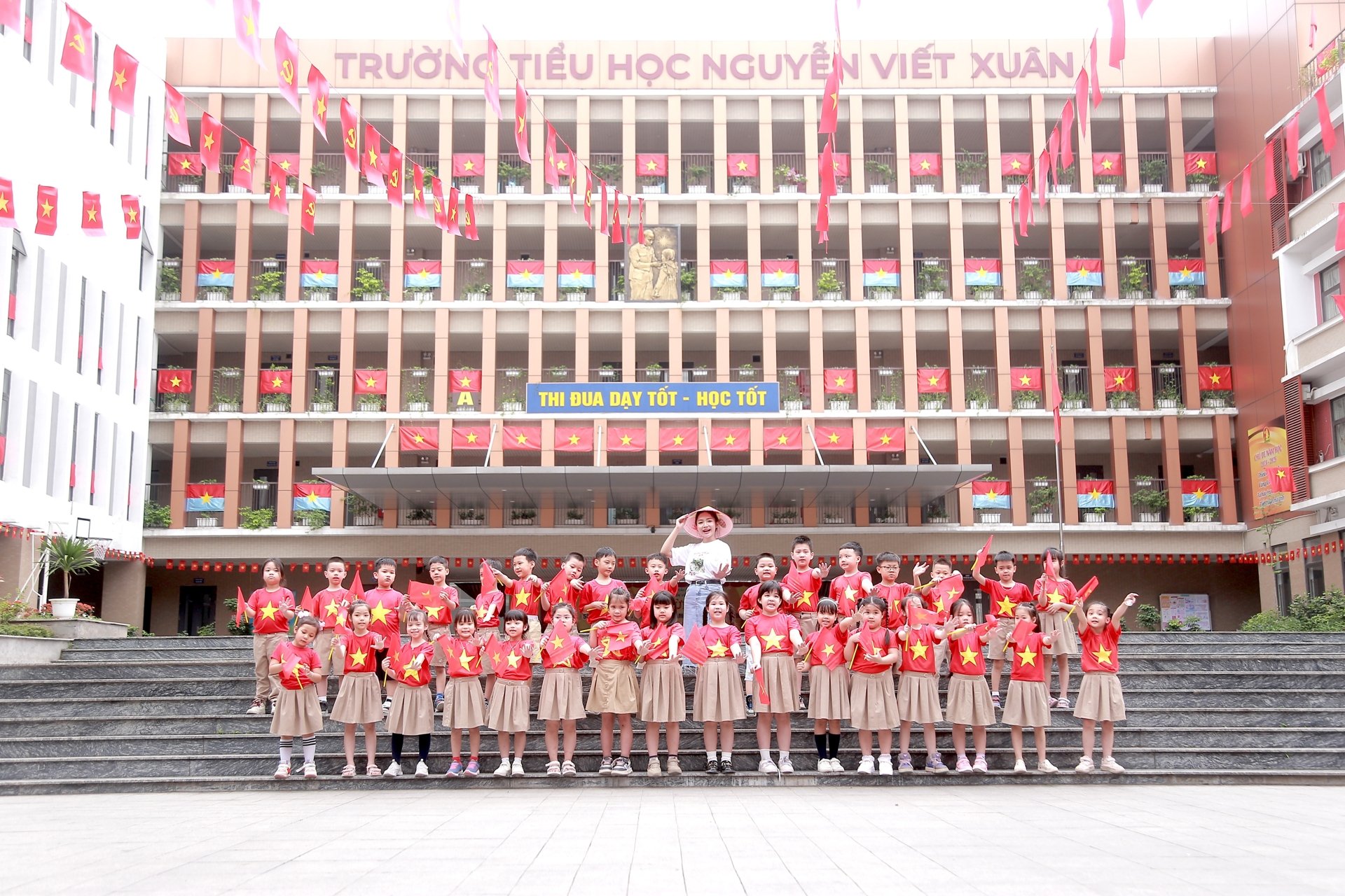 Sân trường khai giảng luôn rực rỡ với cờ Tổ Quốc, cờ Đảng, cờ dây sao Đảng. Sự xuất hiện của dây cờ giúp tạo không khí tưng bừng, trang trọng.