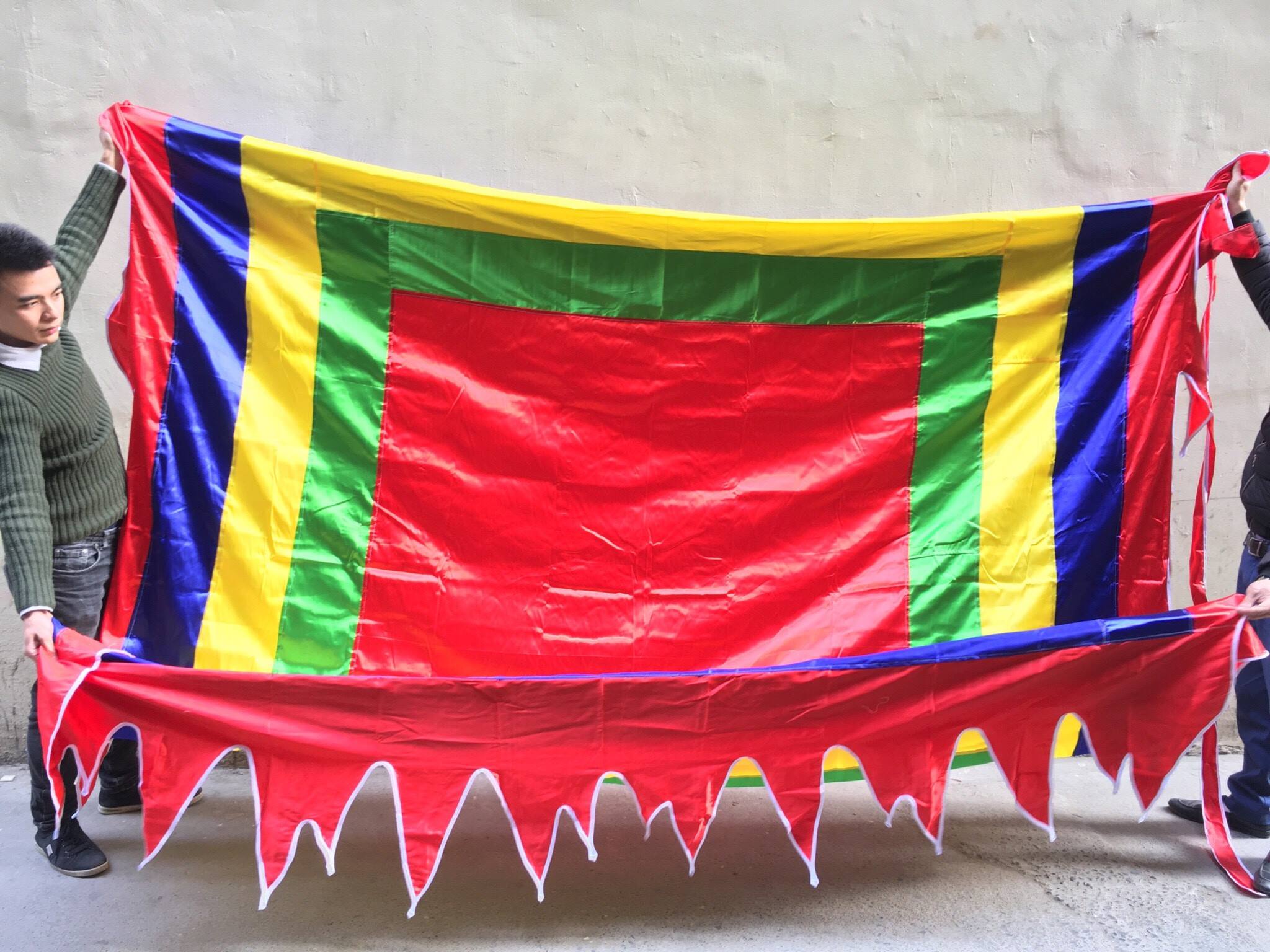 Màu sắc đỏ – vàng – xanh lam – xanh lá – trắng, tượng trưng cho ngũ hành, cầu may mắn và bình an. Phù hợp cho đình chùa, sân lễ hội, rước kiệu.