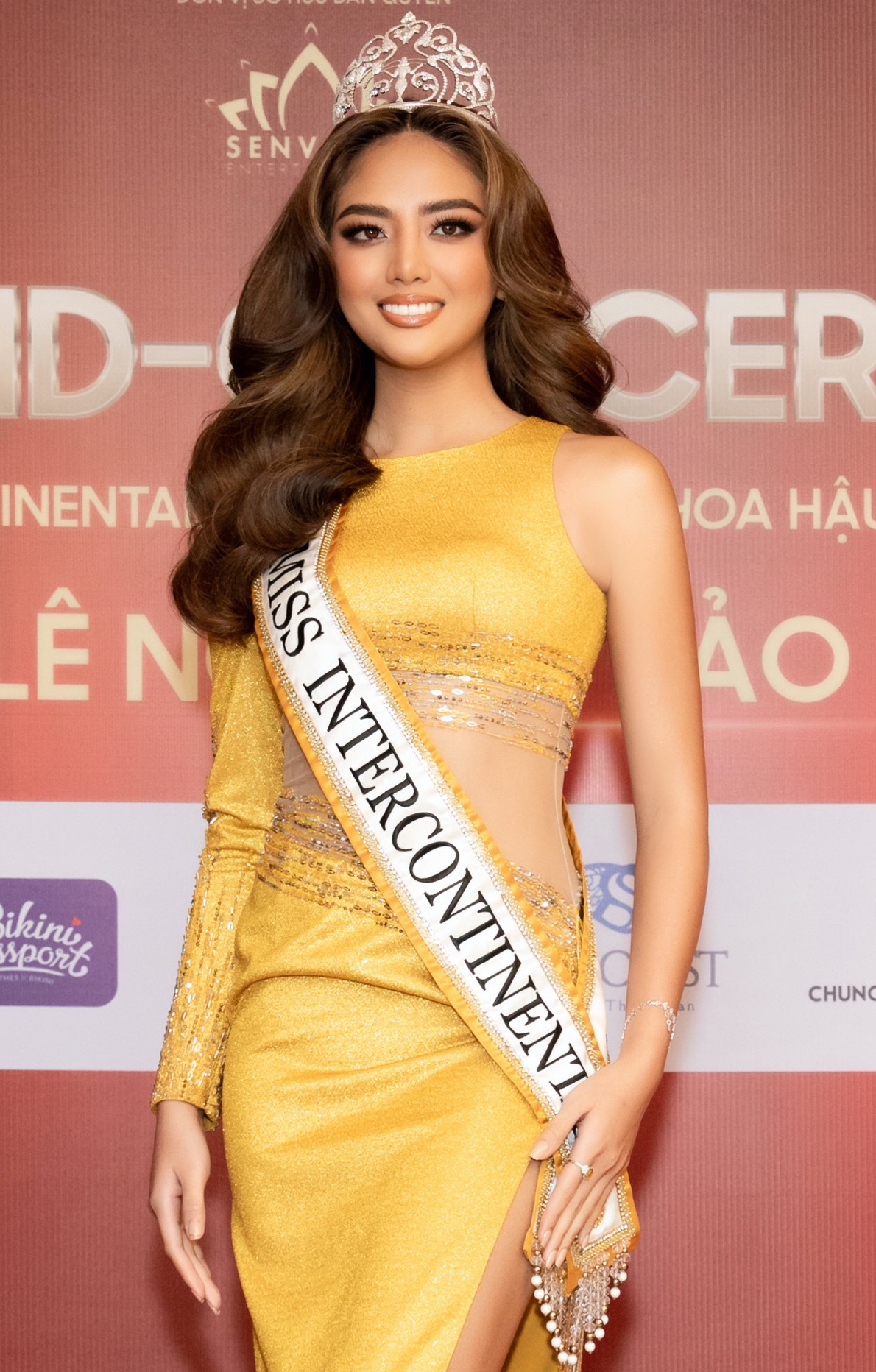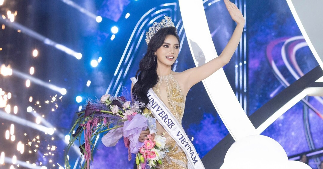 Hình ảnh sash hoa hậu HOÀNG GIA sử dụng trong lễ đăng quang, tạo điểm nhấn trang trọng.